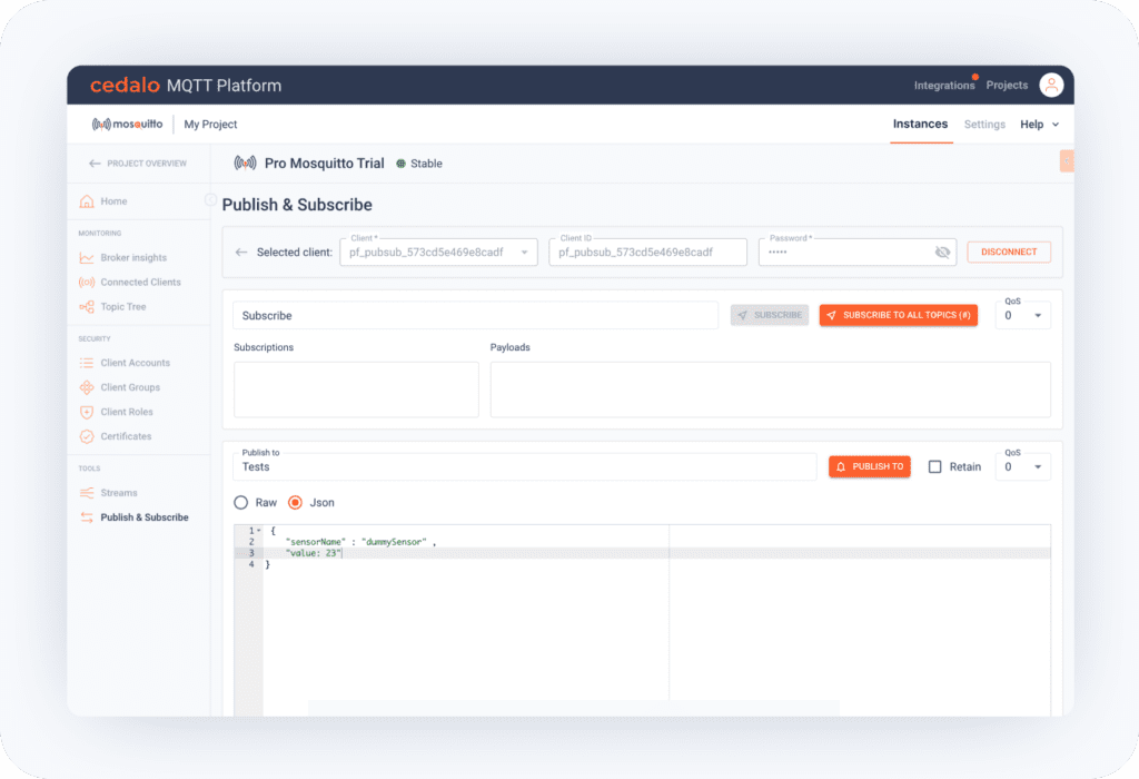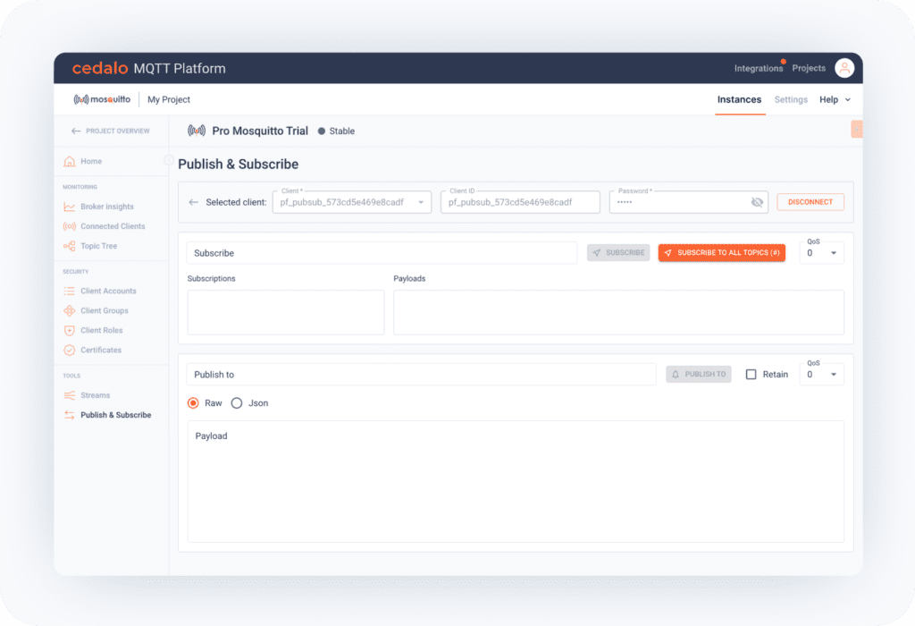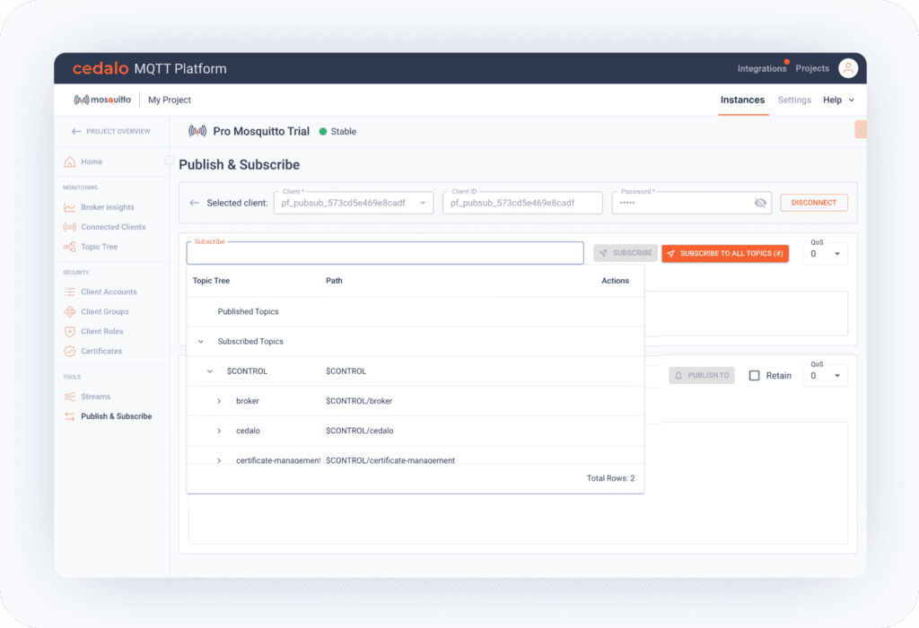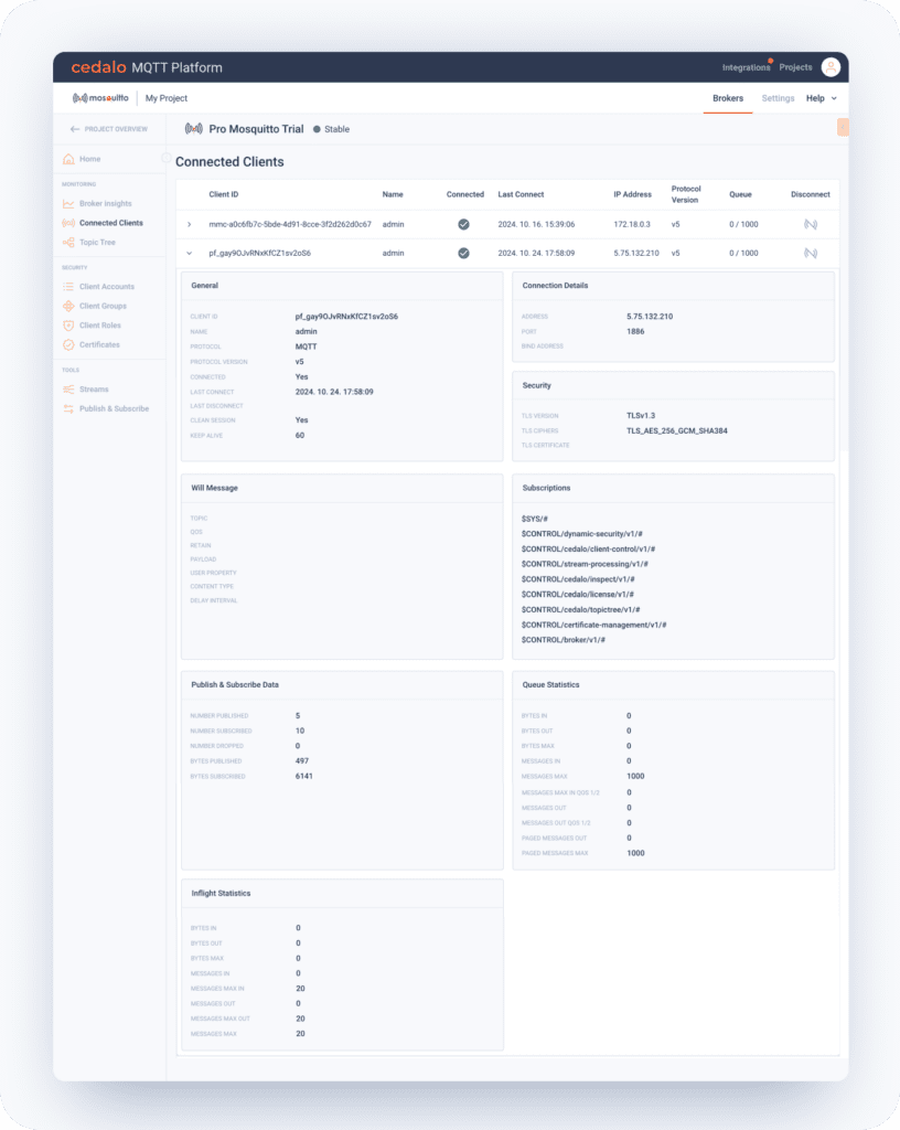 - Cloud Broker Management: Easily configure, monitor, and manage all your cloud-based Pro Mosquitto brokers directly from your Cedalo Cloud account.