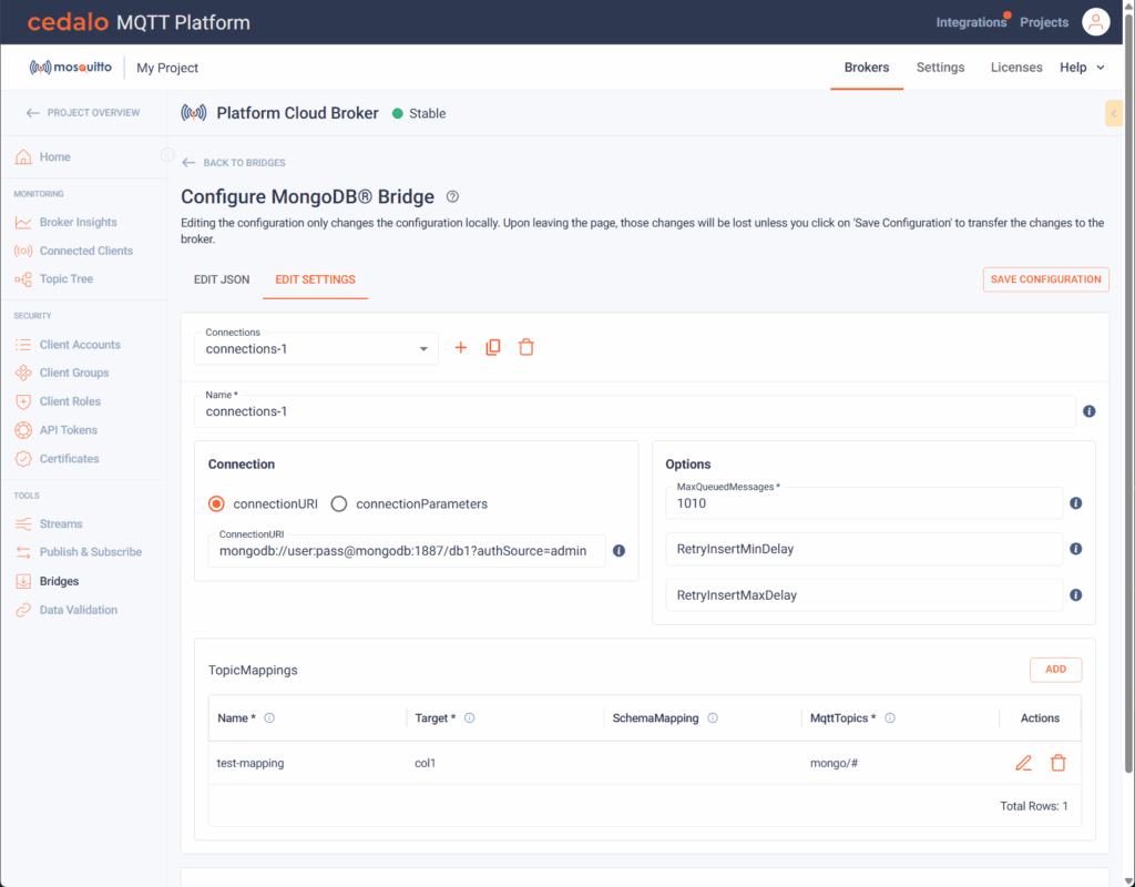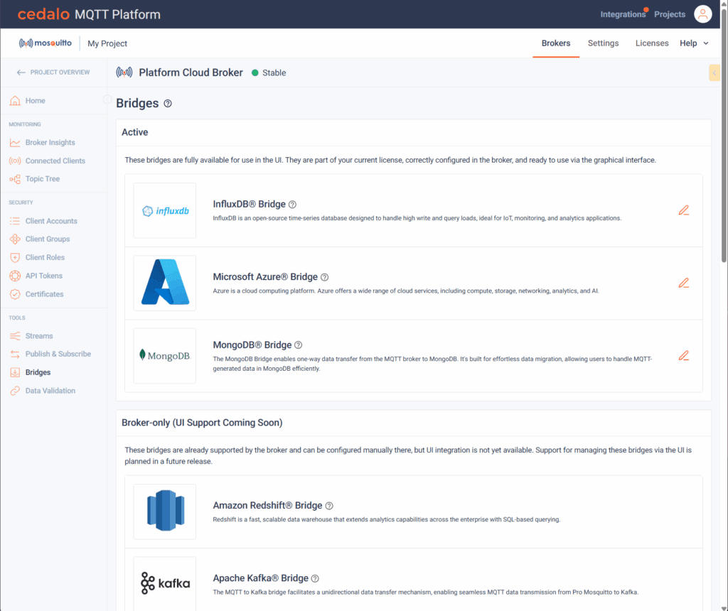 Feature Description: Users can now configure and manage InfluxDB, Azure Event Hubs, and MongoDB bridges directly in the Cedalo Web UI. This user interface allows administrators to add, update, or remove bridges in real time, without editing config files or restarting the broker.