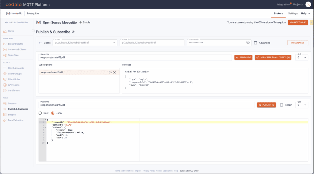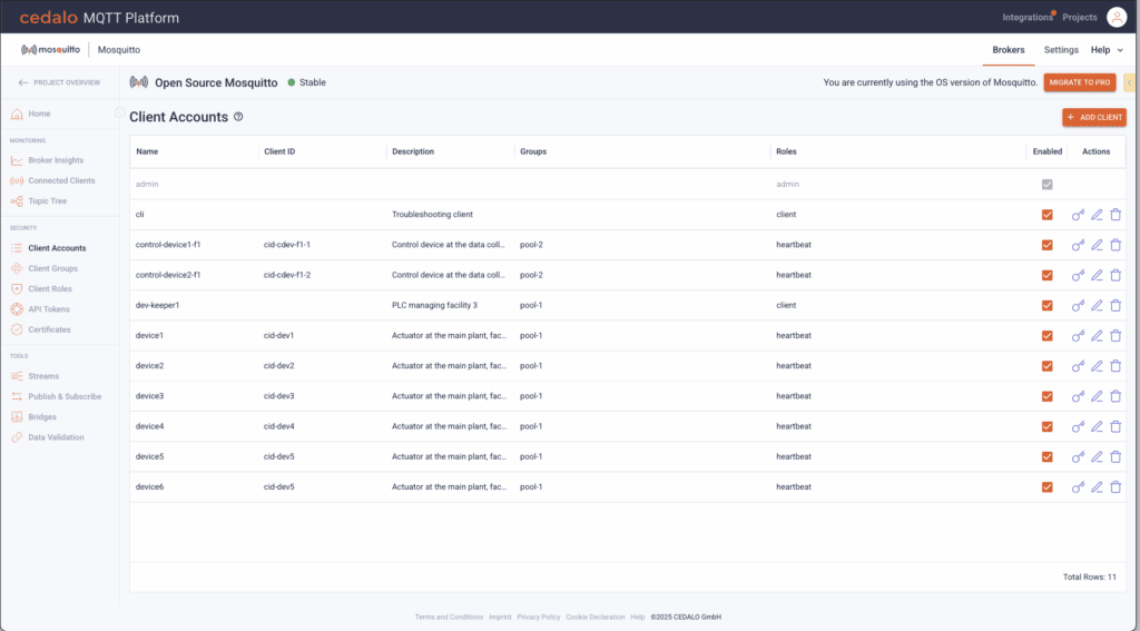 User Benefit: This is a breakthrough for organizations already running open-source Mosquitto in production. Without needing to migrate or refactor existing setups, users can now integrate OS brokers into the Cedalo ecosystem and benefit from centralized monitoring, UI tools, and enterprise controls.