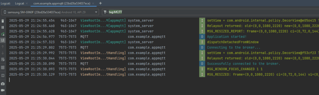 Then, type the custom tag (i.e., “MQTT”) in the search bar to only display the relevant entries. Once the application starts and connects to the broker, you can visualize the following logs, proving that LogCat is correctly receiving our application’s logs: